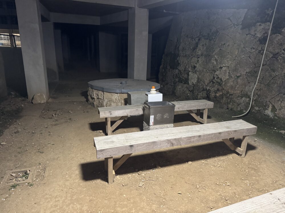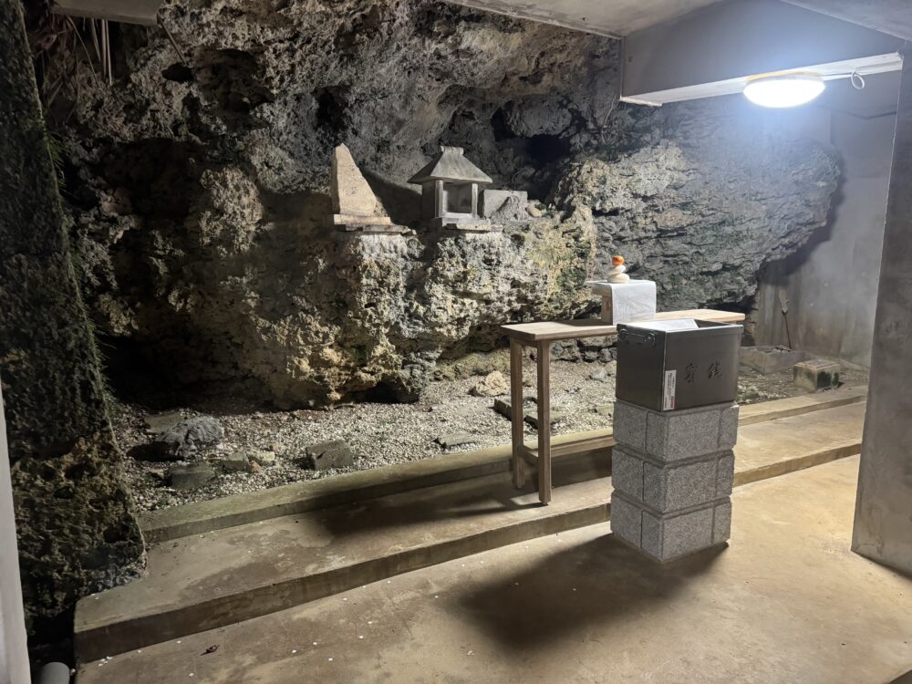 上層には拝殿・本殿が鎮座し、その階下には社務所や居住空間、そしてさらに降りた最下層には、自然の洞窟(ガマ)をそのまま活かした神秘的な拝所が広がっています。